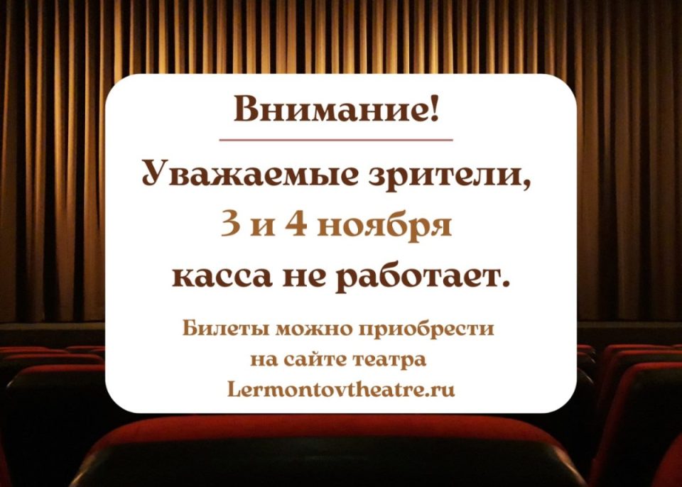 Уважаемые зрители! 3 и 4 ноября театральная касса не работает. Билеты можно приобрести на сайте театра.