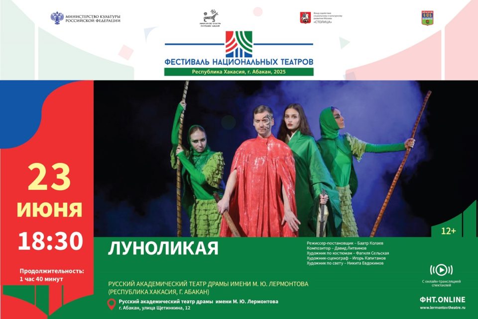 Торжественное открытие фестиваля состоится 23 июня премьерой юбилейного сезона театра Лермонтова – этно-фэнтези по мотивам хакасского эпоса «Луноликая» (12+).